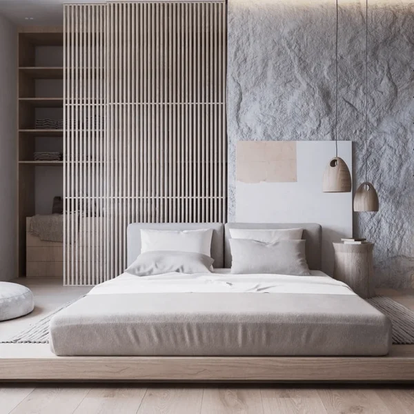 Gỗ, đá, và kim loại là những vật liệu thường được sử dụng trong phòng ngủ tối giản. Chúng không chỉ bền bỉ mà còn mang lại cảm giác gần gũi và ấm cúng. Vật liệu tự nhiên cũng góp phần tạo nên sự tinh tế và sang trọng cho không gian.